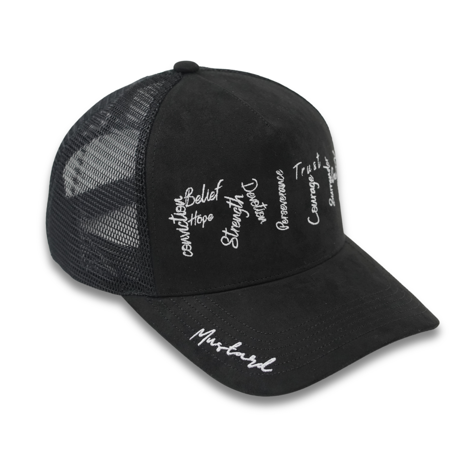 Side view of the Cotton Faith black suede trucker hat featuring embroidered faith-based words like Belief, Strength, and Trust, with mesh paneling and "Mustard" stitched on the brim.